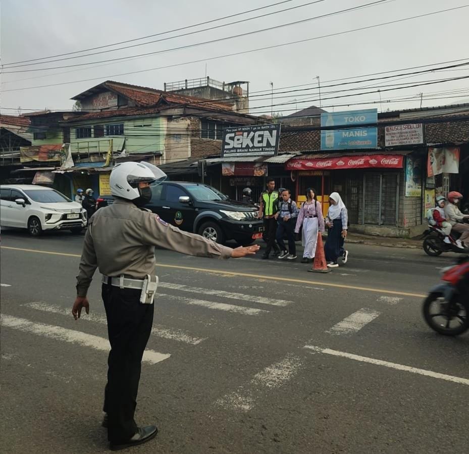 Sigap di Pagi Hari, Polisi Lantas Polsek Cileunyi Bantu Anak Sekolah Menyebrang dan Atur Arus Lalu Lintas di Depan Sekolah Mekar Arum