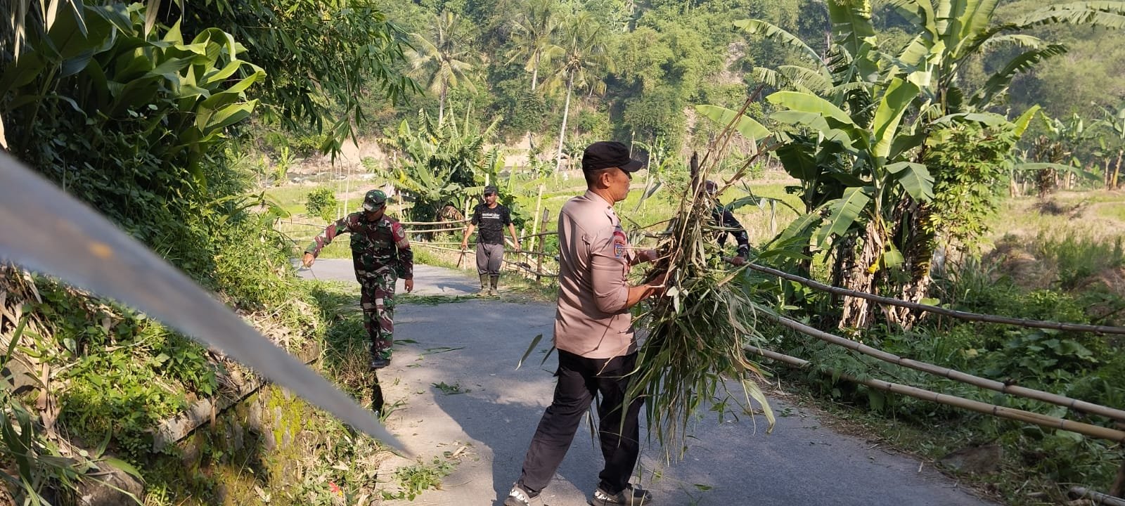 Warga terlihat antusias mengikuti kerja bakti tersebut, bersama-sama mencabut rumput liar, menyapu, serta mengumpulkan sampah yang mengganggu pemandangan dan kebersihan jalan desa. Kebersamaan ini tidak hanya menciptakan lingkungan yang bersih, tetapi juga mempererat hubungan antara aparat kewilayahan dan masyarakat.
