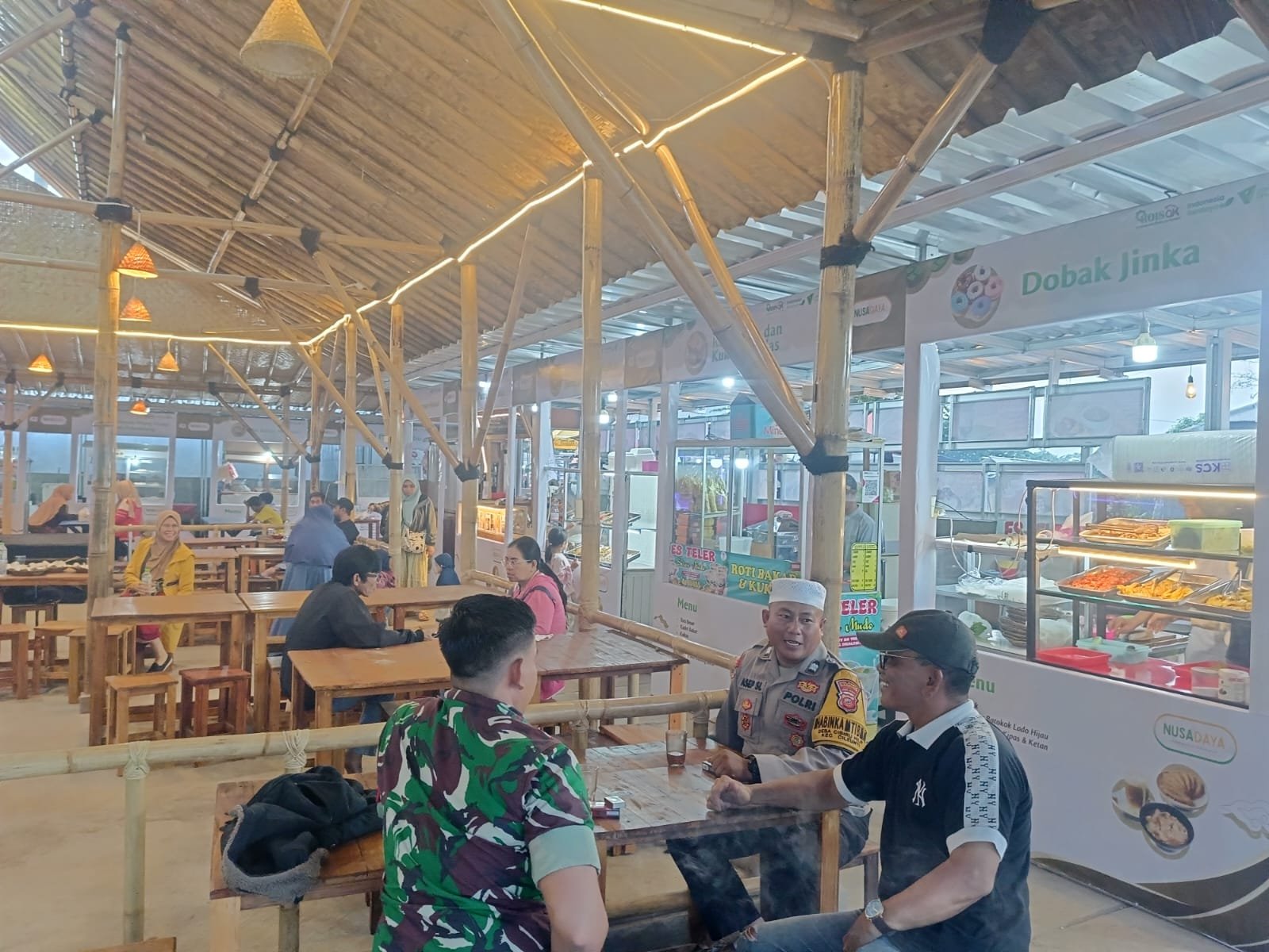 Dalam suasana santai dan penuh keakraban, petugas TNI-Polri berdialog dengan pengelola dan para pelaku UMKM yang beraktivitas di kawasan foodcourt tersebut. Dialog ini membahas berbagai hal, mulai dari situasi keamanan lingkungan, kenyamanan pengunjung, hingga dukungan terhadap keberlangsungan usaha mikro, kecil, dan menengah (UMKM) warga setempat.
