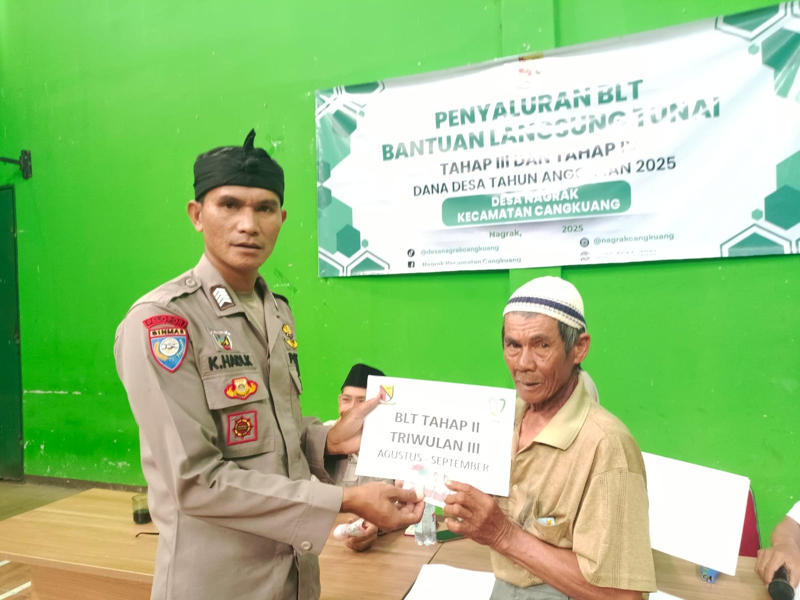 Cangkuang, Bandung – Bhabinkamtibmas Desa Ciluncat Polsek Cangkuang Polresta Bandung, Bripka Kojang Hadi Kusumah, S.H., menghadiri kegiatan penyaluran insentif Ketua RT/RW Desa Nagrak yang dilaksanakan di GOR Desa Nagrak, Kampung Panyaungan RT 01 RW 01, Desa Nagrak, Kecamatan Cangkuang, Kabupaten Bandung. Rabu (24/12/2025).