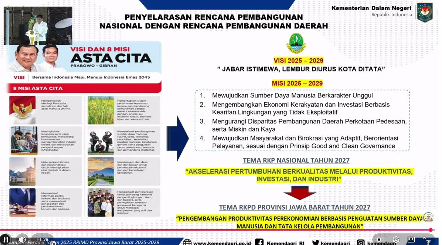 Dalam forum tersebut, tema pembangunan RKPD Jawa Barat tahun 2027 mengusung “Pengembangan Produktivitas Perekonomian Berbasis Penguatan Sumber Daya Manusia dan Tata Kelola Pembangunan.” Tema ini menjadi arah kebijakan strategis dalam mendorong pertumbuhan ekonomi yang berkelanjutan dan merata di seluruh wilayah Jawa Barat.