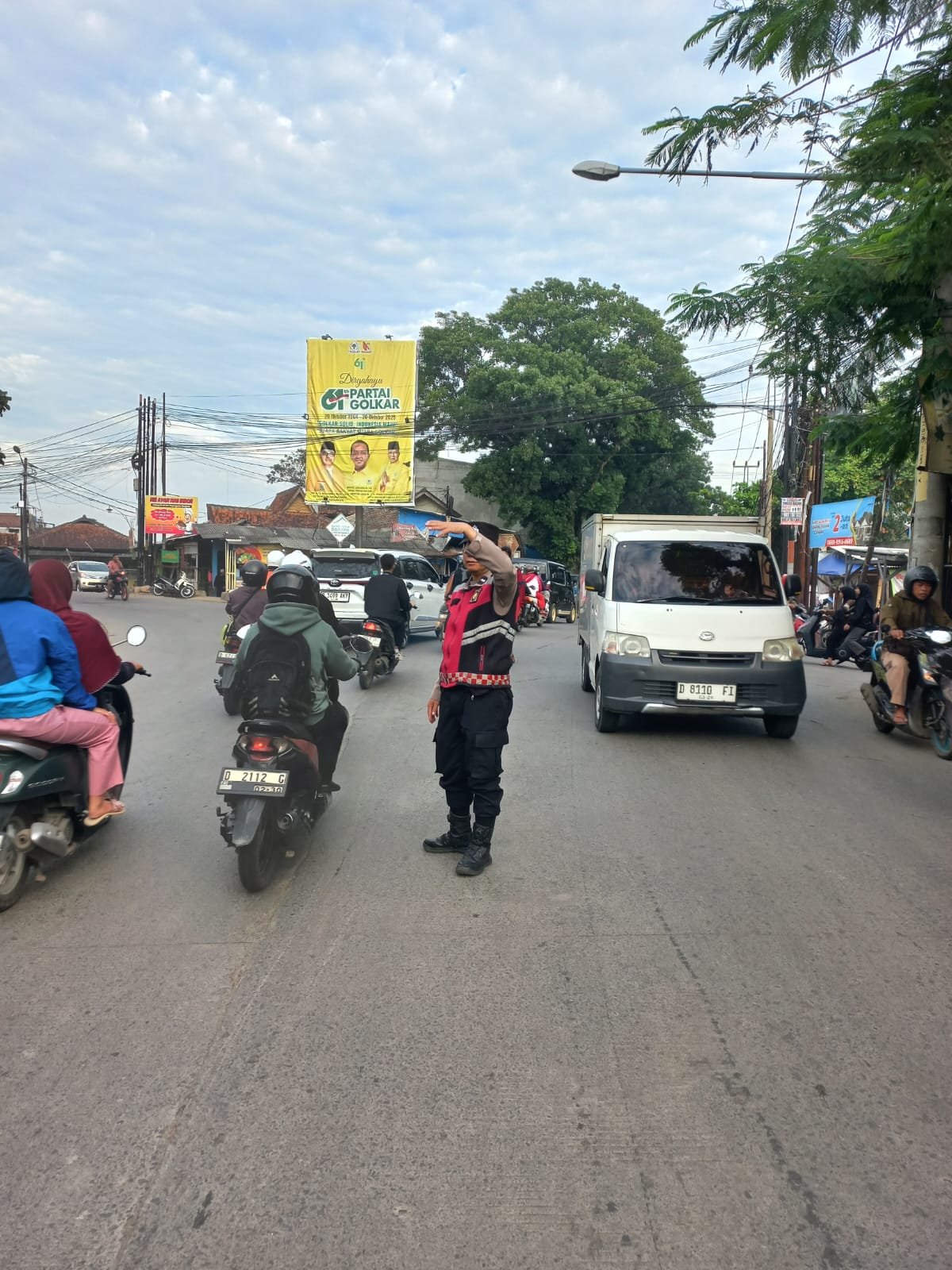 Unit Samapta Polsek Baleendah melaksanakan kegiatan pengaturan lalu lintas di pertigaan Munjul, Kecamatan Baleendah, Kabupaten Bandung.