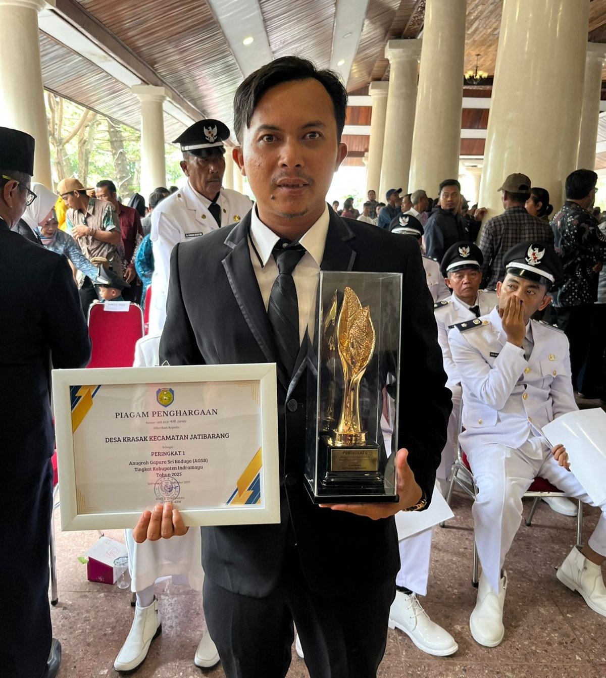 Desa Krasak mendapat piagam penghargaan terbaik serta stimulus program kegiatan atau bantuan keuangan sebesar Rp. 1.000.000.000,- ( satu miliar rupiah ) serta Piala Juara 1 lomba kebersihan tingkat Kabupaten Indramayu, di sela-sela acara pelantikan 138 Kuwu serentak di Pendopo Indramayu, Kamis (12/2/2026).