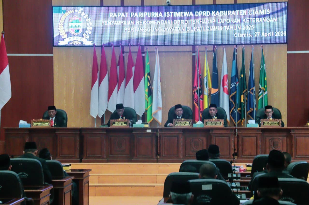 Ciamis, mata-peristiwa.id – Dewan Perwakilan Rakyat Daerah (DPRD) Kabupaten Ciamis menggelar Rapat Paripurna Penyampaian Rekomendasi terhadap Laporan Keterangan Pertanggungjawaban (LKPJ) Bupati Ciamis Tahun 2025, Senin (27/4/2026), bertempat di Aula Tumenggung Wiradikusumah, DPRD Kabupaten Ciamis.