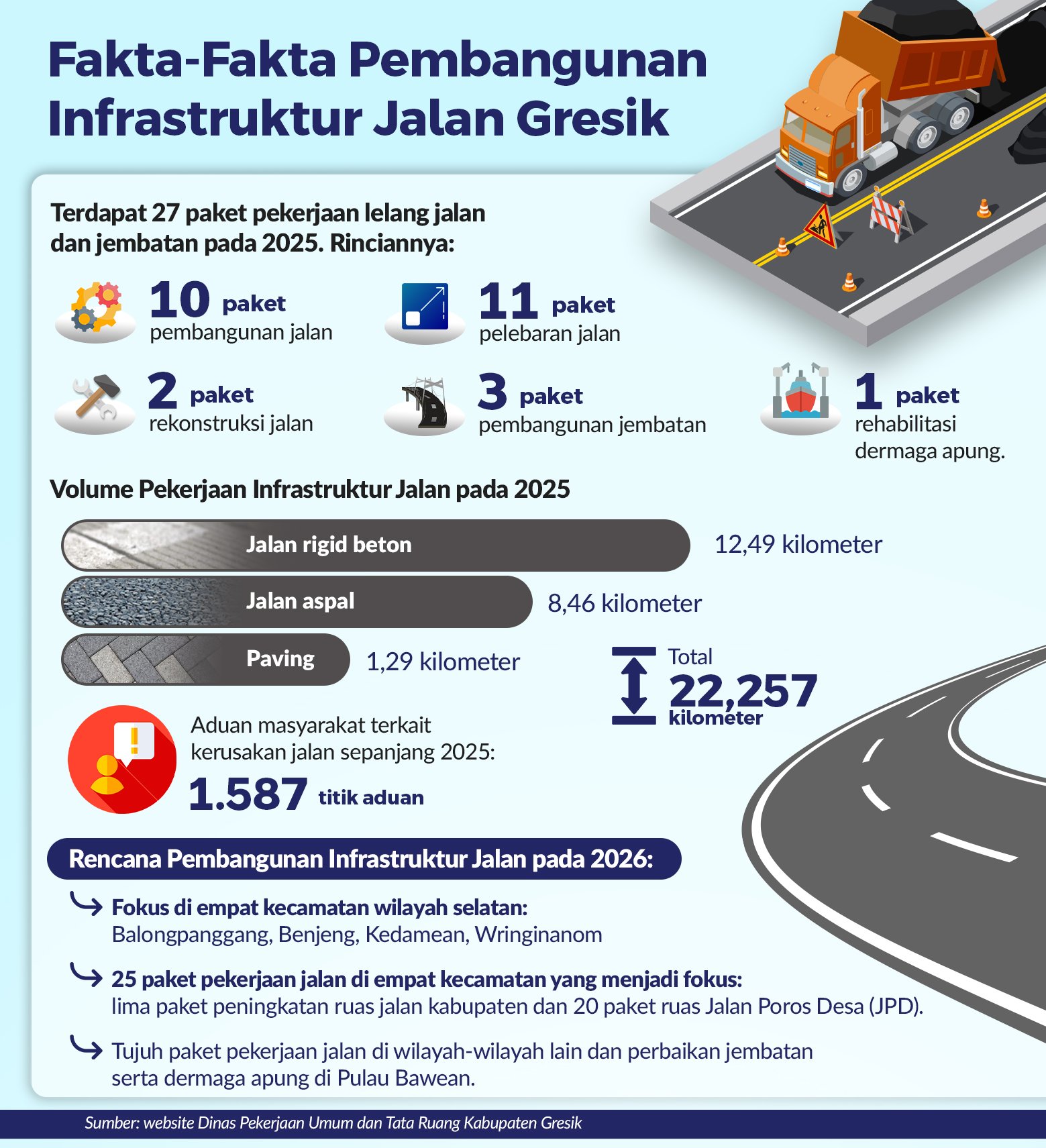 Berdasar kondisi terkini di Kabupaten Gresik, kebutuhan pembangunan maupun peningkatan struktur jalan di wilayah pelosok desa masih cukup tinggi (lihat grafis). Sekitar 70 persen anggaran dinilai perlu diarahkan untuk pembangunan dan peningkatan, sementara 30 persen untuk program pemeliharaan. Skema itu diharapkan mampu mempercepat pemerataan kualitas infrastruktur jalan.