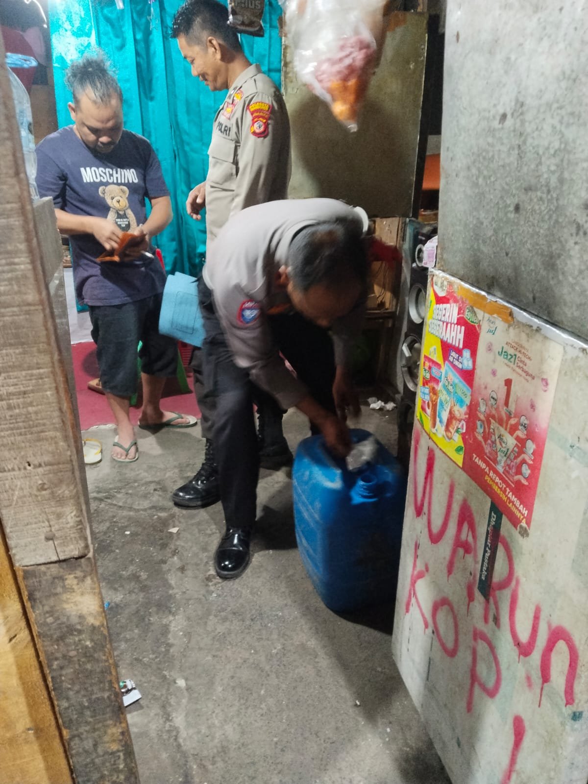 Selanjutnya, di kios milik Sdr. Romen Pak Pahan yang beralamat di Jalan Moch. Toha, Kelurahan Pasawahan, Kecamatan Dayeuhkolot, petugas kembali mengamankan satu jerigen tuak.