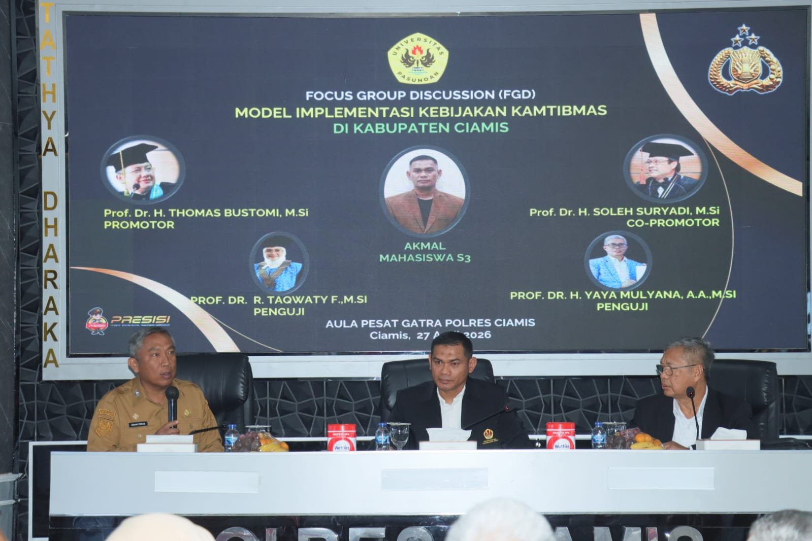 Ciamis, mata-peristiwa.id – Sekretaris Daerah Kabupaten Ciamis, Andang Firman Triyadi, menghadiri kegiatan Focus Group Discussion (FGD) bertajuk *Model Implementasi Kebijakan Kamtibmas di Kabupaten Ciamis* yang digelar oleh AKBP Akmal dalam rangka Program Doktor Ilmu Sosial Universitas Pasundan Bandung Tahun 2026. Kegiatan tersebut berlangsung pada Senin (27/04) di Aula Pesat Gatra Polres Ciamis.