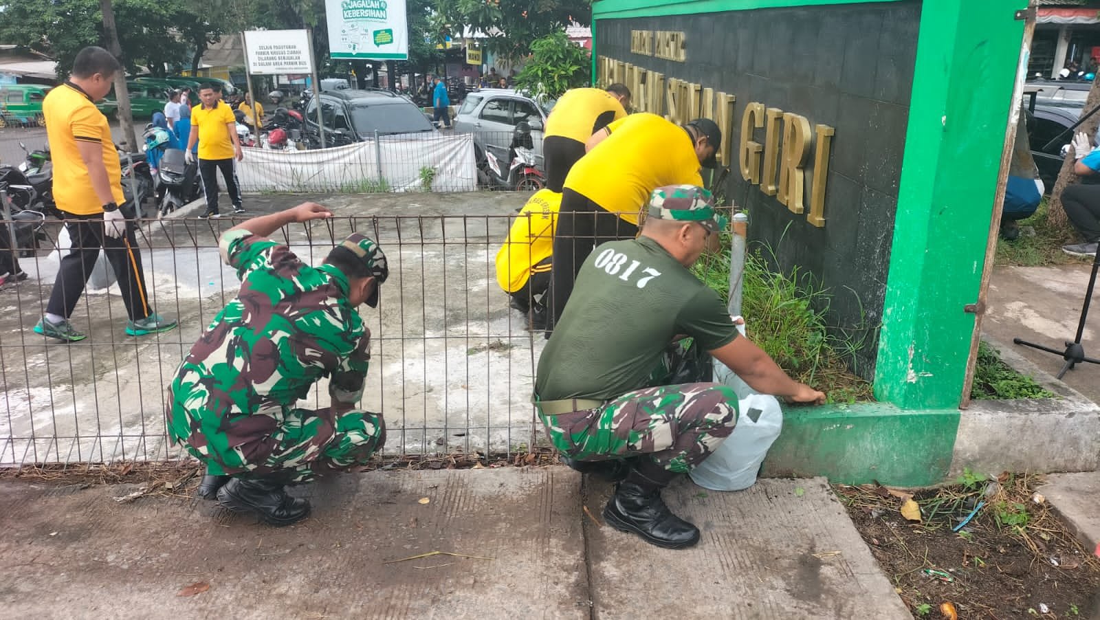 Usai apel, seluruh peserta langsung bergerak melaksanakan aksi bersih-bersih di Area Parkir Bus Giri. Mereka membersihkan sampah, memangkas rumput liar, serta merapikan area sekitar agar lebih tertata dan indah. Kebersamaan terlihat jelas saat unsur TNI-Polri, aparatur pemerintah, dan warga bergotong royong tanpa sekat.