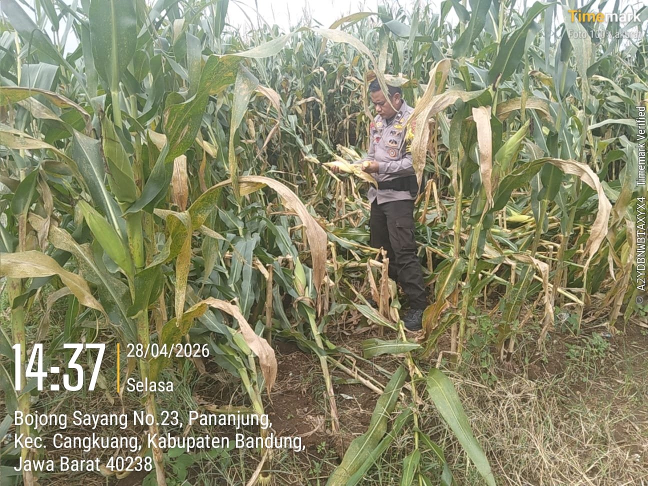 Menyikapi hal tersebut, Bhabinkamtibmas Desa Pananjung Polsek Cangkuang Polresta Bandung, Aipda Mohammad Ramadan, turun langsung ke lapangan untuk melakukan pengecekan tanaman jagung pipil milik Polsek Cangkuang hasil tanam kuartal I tahun 2026 yang berada di Kampung Bojongsayang, Desa Pananjung, Kecamatan Cangkuang, Kabupaten Bandung.
