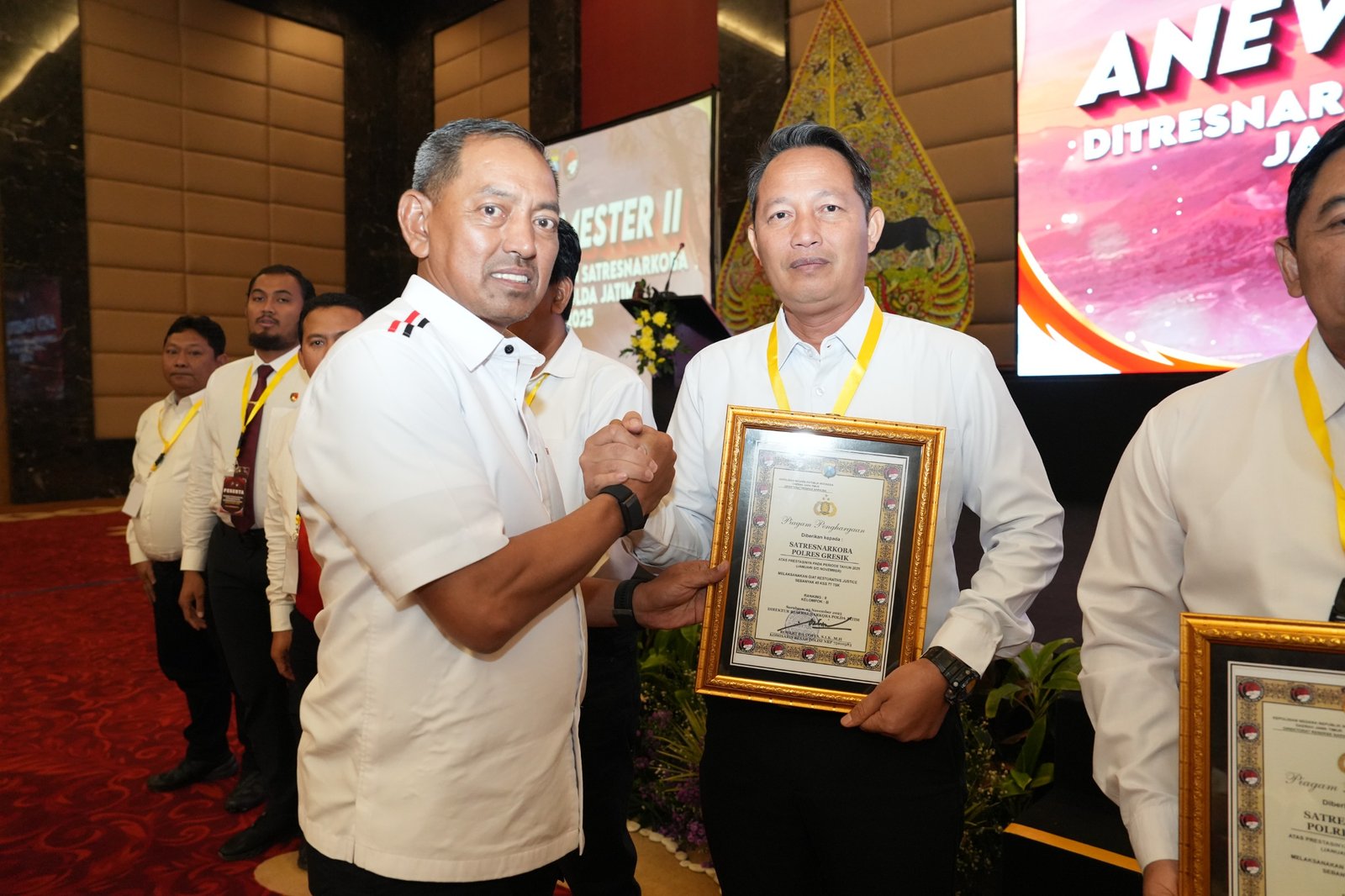 Penghargaan tersebut diserahkan langsung oleh Direktur Reserse Narkoba Polda Jawa Timur, Kombes Pol. Robert Da Costa, kepada Kasat Resnarkoba Polres Gresik, AKP Ahmad Yani, dalam kegiatan yang berlangsung pada Kamis hingga Jumat di Hotel The Singhasari Resort Batu, Kota Batu.