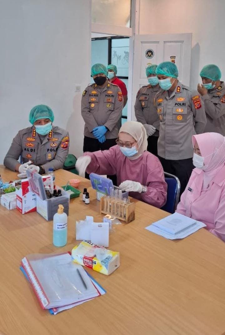 Kapolresta Bandung Kombes Pol Aldi Subartono S.H.,S.I.K.,M.H.,CPHR dan jajaran PJU menyaksikan secara detail tata cara pemeriksaan keamanan pangan atau food safety menggunakan metode cepat, yaitu Rapid Test Kit yang dirancang untuk mendeteksi berbagai zat berbahaya.