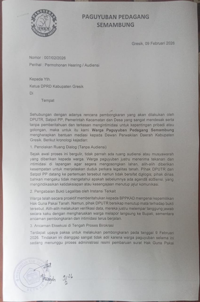 Warga lapak yang tergabung dalam Paguyuban Pedagang Semambung tersebut sekaligus menyerahkan surat permohonan hearing atau audiensi kepada DPRD Gresik. Surat bernomor 007/02/2026 tertanggal 9 Februari 2026 itu ditujukan kepada Ketua DPRD Kabupaten Gresik, berisi permintaan agar DPRD memfasilitasi mediasi terkait rencana pembongkaran lapak yang dinilai dilakukan secara sepihak.