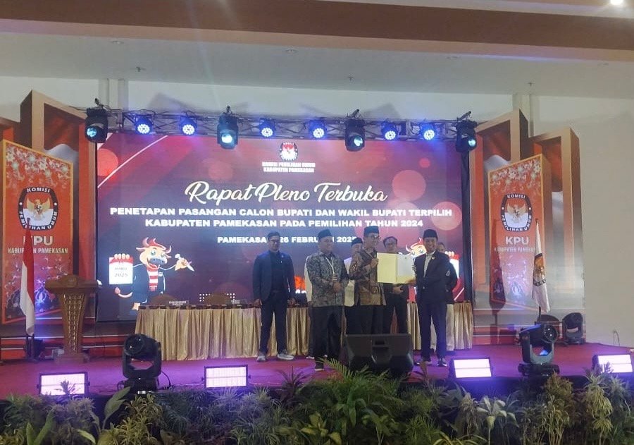 Pamekasan, Mataperistiwa.id// Komisi Pemilihan Umum (KPU) Kabupaten Pamekasan resmi menetapkan pasangan Kyai Haji Khalilurrahman, S.H., M.Si., dan Haji Sukrianto sebagai Bupati dan Wakil Bupati Pamekasan terpilih dalam Pemilihan Kepala Daerah (Pilkada) 2024. Penetapan ini dilakukan dalam Rapat Pleno Terbuka yang berlangsung di Ballroom Hotel Odaita Pamekasan pada Rabu (26/2/2025) malam.