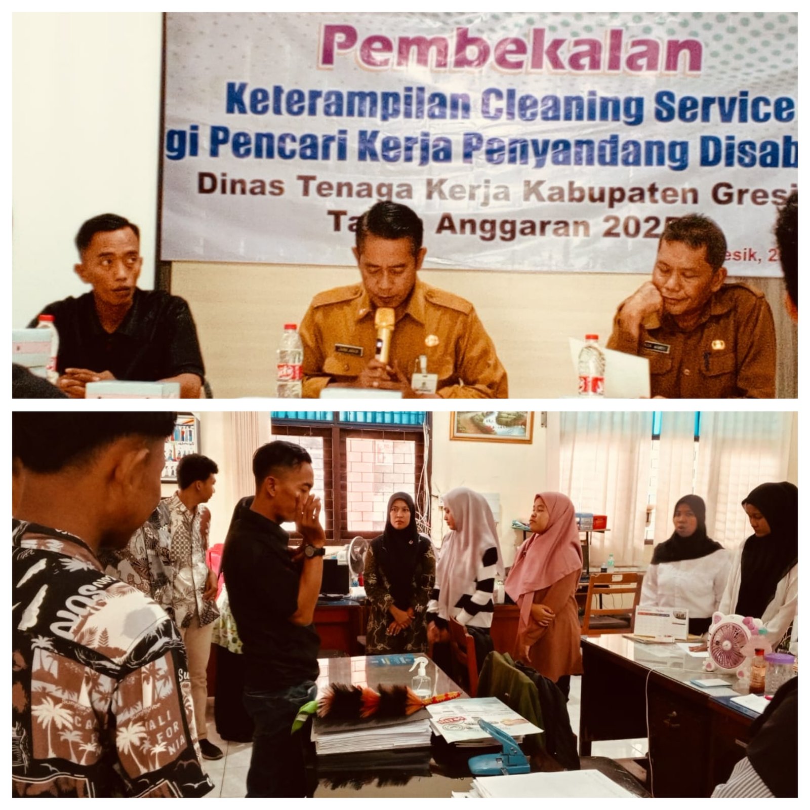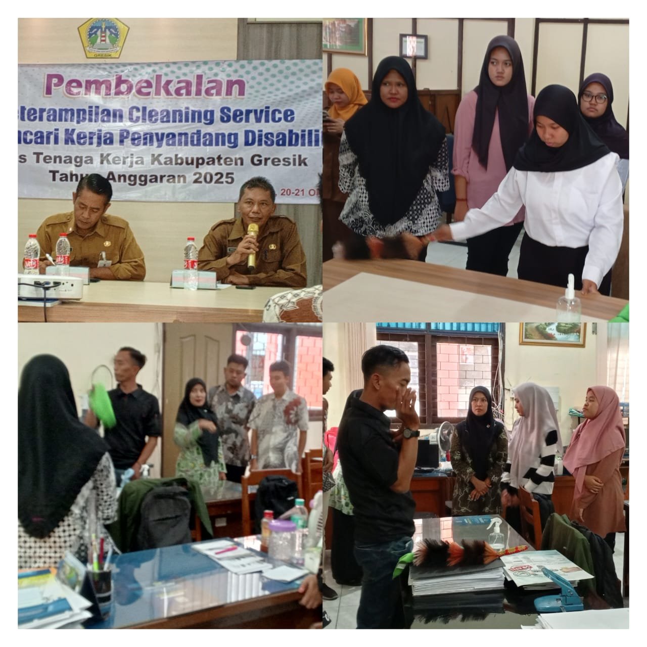 Gresik,mataperistiwa.id – Program Pembekalan Ketrampilan Cleaning Service Bagi Pencari Kerja Penyandang Disabilitas di laksanakan oleh Dinas Tenaga Kerja Kab Gresik TA 2025 di Ruang Pertemuan Disnaker jln Dr Wahidin SHD no 233 Desa Kembangan . Kec.Kebomas .Senin 20/10/2025.