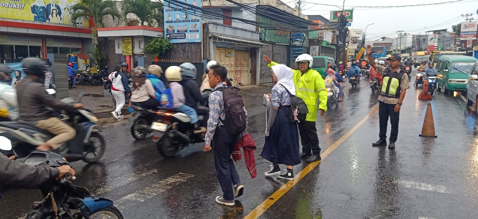 Tak hanya mengatur lalu lintas, Aiptu Awal Candra juga aktif membantu penyeberangan anak-anak sekolah serta warga yang melintas di sekitar lokasi. Kehadirannya di tengah guyuran hujan memberikan rasa aman dan nyaman bagi para siswa yang hendak masuk sekolah, sekaligus mengurangi risiko kecelakaan lalu lintas di ruas jalan yang licin akibat hujan.