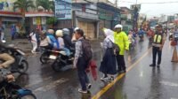 Meski Diguyur Hujan, Polisi Tetap Sigap Atur Lalu Lintas dan Bantu Siswa Menyeberang