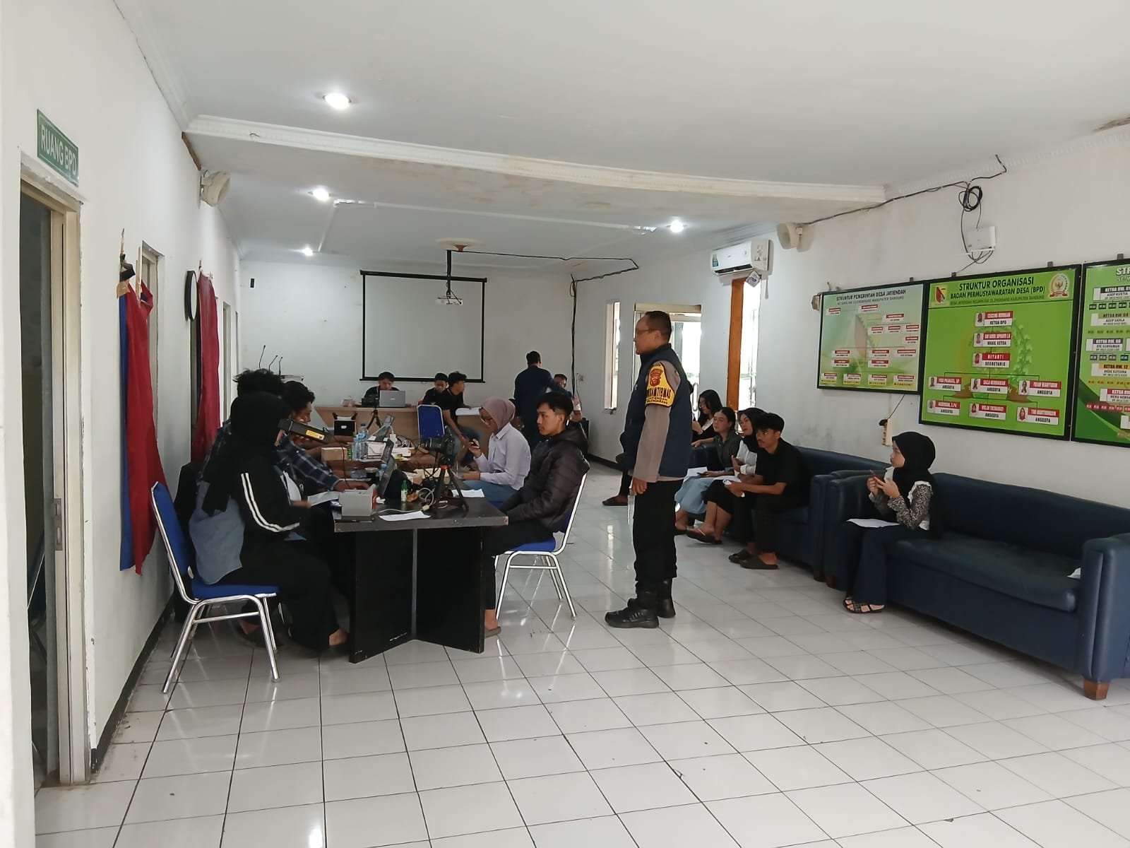 Aiptu Robi Mahrom terlihat aktif berkoordinasi dengan perangkat desa dan petugas pelayanan, sekaligus menyapa warga yang sedang menunggu antrean. Ia memastikan alur pelayanan berjalan sesuai prosedur serta mengimbau masyarakat agar tetap menjaga ketertiban selama proses perekaman berlangsung.