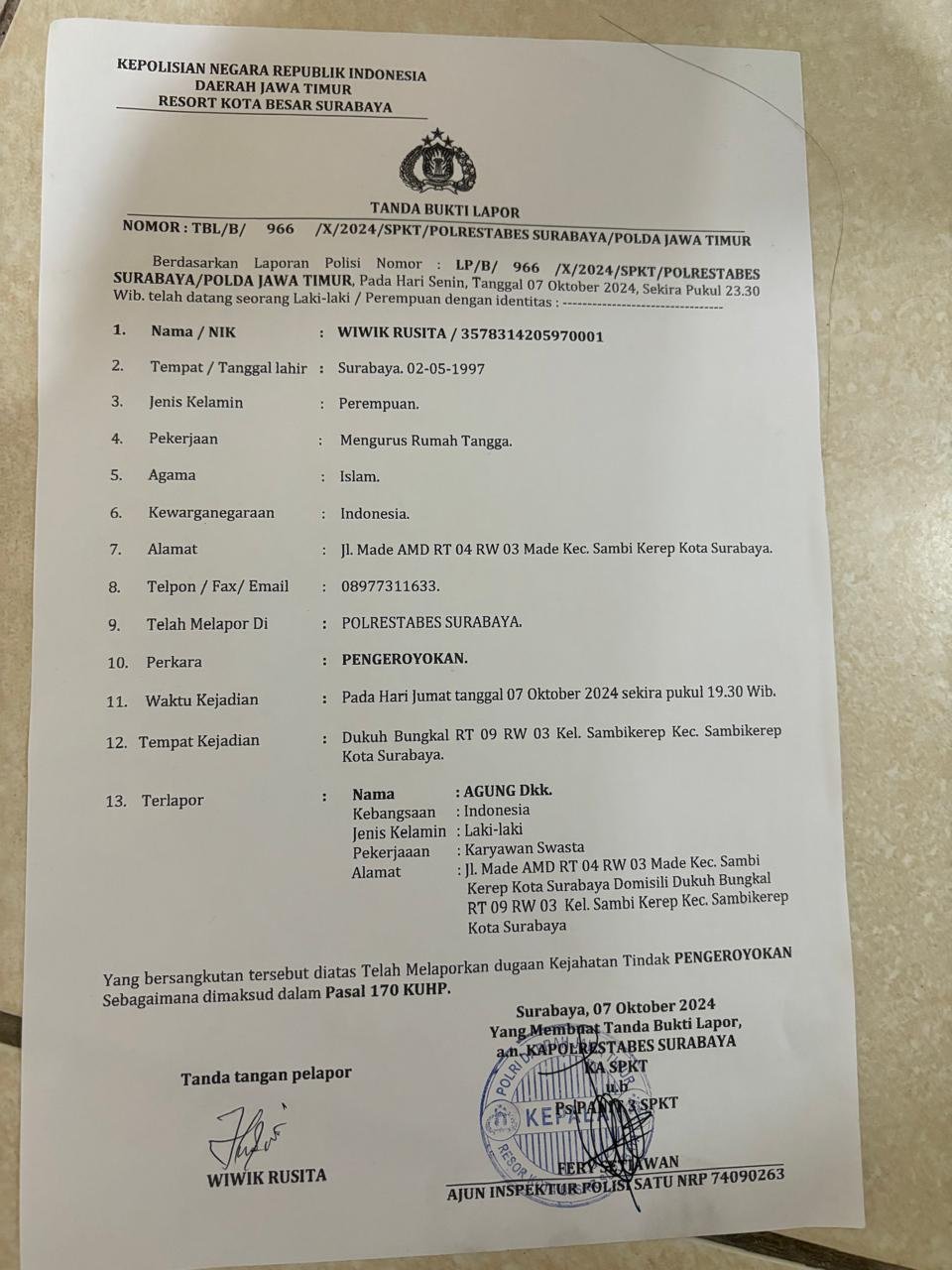 Dokumen itu menerangkan bahwa seorang warga Surabaya bernama WR, yang berprofesi sebagai ibu rumah tangga, secara resmi telah melapor ke Polrestabes Surabaya pada Senin, 07 Oktober 2024 sekitar pukul 23.30 WIB.