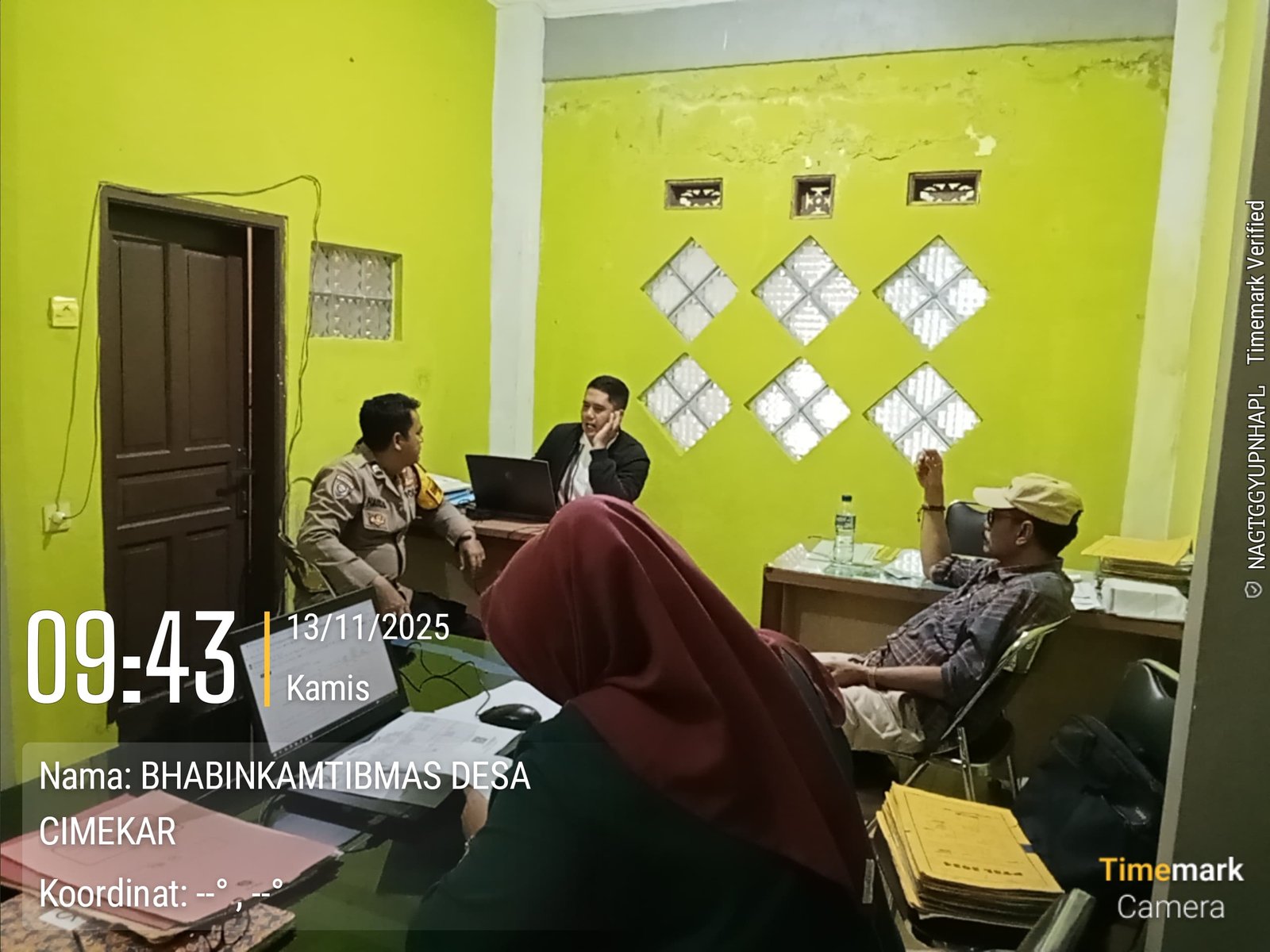 Cileunyi – Dalam upaya menjaga dan memperkuat situasi keamanan serta ketertiban masyarakat (Kamtibmas) di wilayah binaannya, Bhabinkamtibmas Desa Cimekar Polsek Cileunyi Polresta Bandung, Aiptu Haris Mugia Kusumah, melaksanakan kegiatan duduk santai dan dialogis Kamtibmas bersama Kepala Desa Cimekar, Bapak Iwan Darmawan, S.Pd, serta para perangkat desa. Kamis (13/11/2025)
