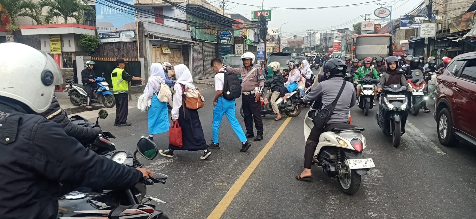 Dengan sigap, petugas membantu para siswa menyeberang jalan serta mengatur kendaraan yang melintas agar tetap tertib dan aman.