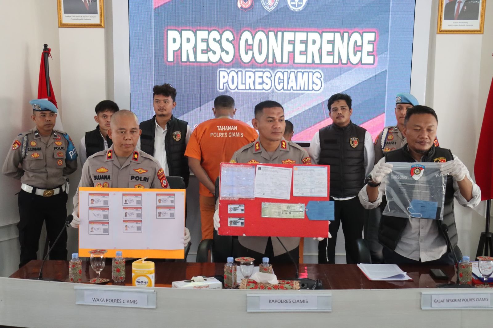Kapolres Ciamis AKBP Akmal, S.H., S.I.K., M.H. didampingi oleh Wakapolres Kompol Sujana, S.Pd., dan Kasat Reskrim AKP Carsono, S.H. mengumumkan keberhasilan pengungkapan kasus tindak pidana pemalsuan surat, khususnya pembuatan dan penggunaan SIM B II Umum palsu.