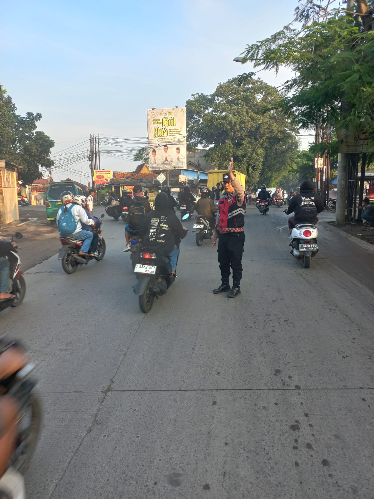 Personel tampak sigap mengatur arus kendaraan dari berbagai arah, sekaligus membantu penyeberangan warga agar tetap aman dan tertib.