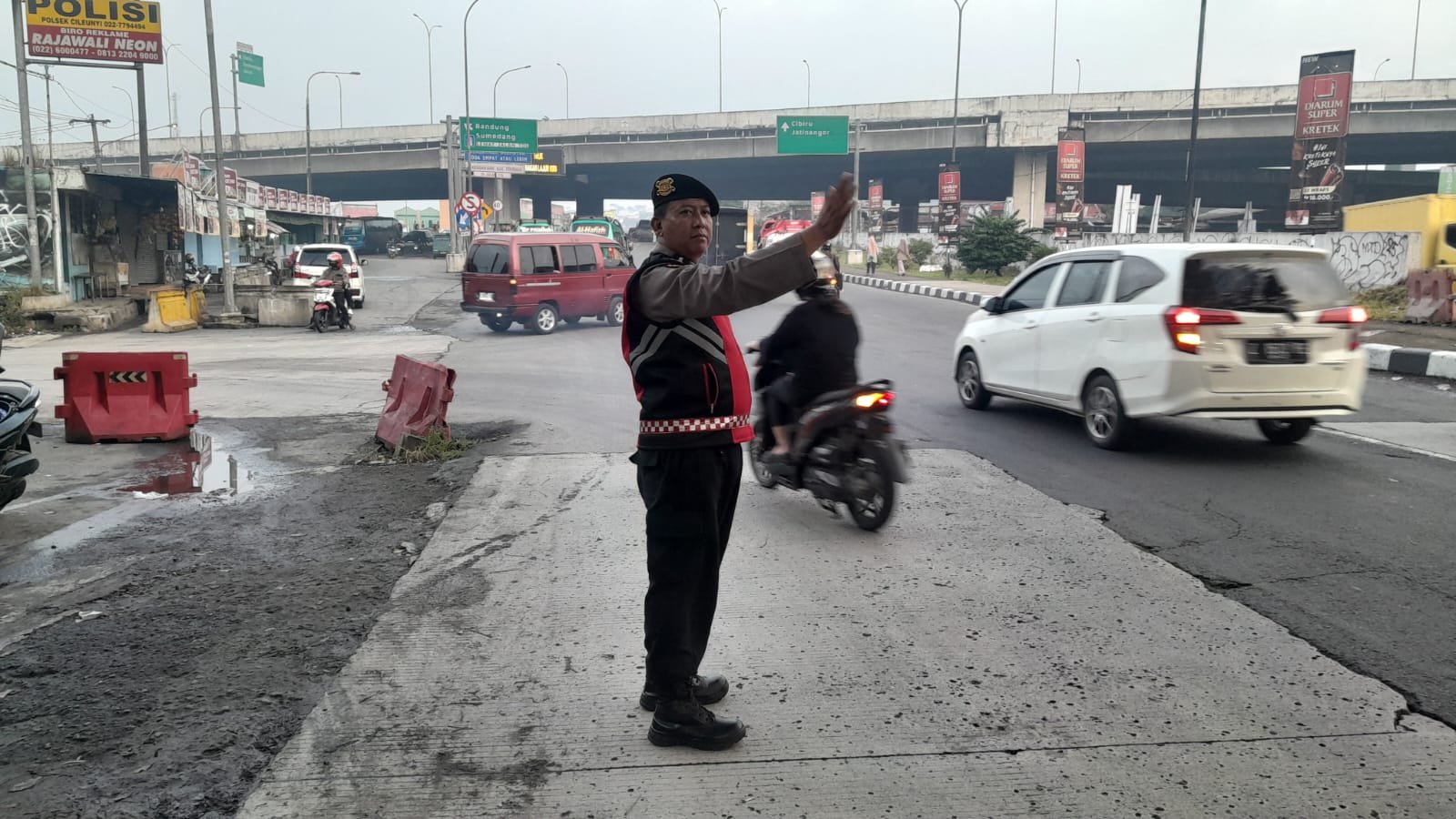 Sejak pagi hari, Aipda Cecep Hermawan terlihat aktif mengatur arus kendaraan di kawasan pertigaan tersebut. Titik ini dikenal sebagai salah satu jalur yang cukup padat karena menjadi akses utama masyarakat menuju kawasan industri, permukiman, serta jalur penghubung ke arah Kota Bandung.