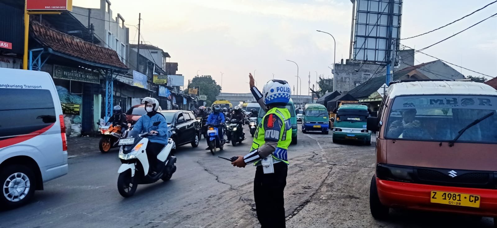 Petugas memberikan arahan kepada para pengendara agar tetap tertib dan mengikuti aturan lalu lintas sehingga arus kendaraan dapat bergerak dengan lebih teratur.