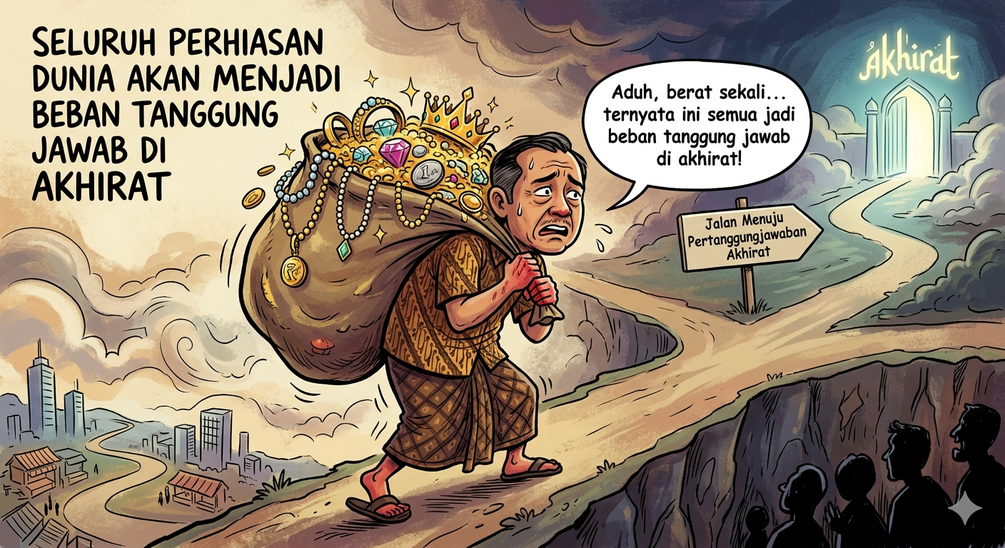 MATA-PERISTIWA.ID – Dunia sering hadir dengan wajah yang menawan. Ia menghiasi dirinya dengan kemewahan, jabatan, harta, pujian, dan segala bentuk kenikmatan yang membuat manusia terpikat. Banyak orang mengira bahwa semakin banyak perhiasan dunia yang dimiliki, maka semakin tinggi pula nilai kehidupannya. Padahal dalam pandangan ruhani, setiap perhiasan dunia yang digenggam bukan sekadar nikmat yang dinikmati, melainkan amanah yang kelak akan dimintai pertanggungjawaban di hadapan Allah.