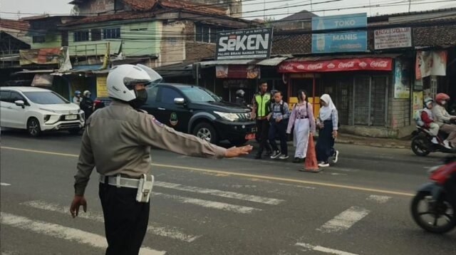 Sigap di Pagi Hari, Polisi Lantas Polsek Cileunyi Bantu Anak Sekolah Menyebrang dan Atur Arus Lalu Lintas di Depan Sekolah Mekar Arum