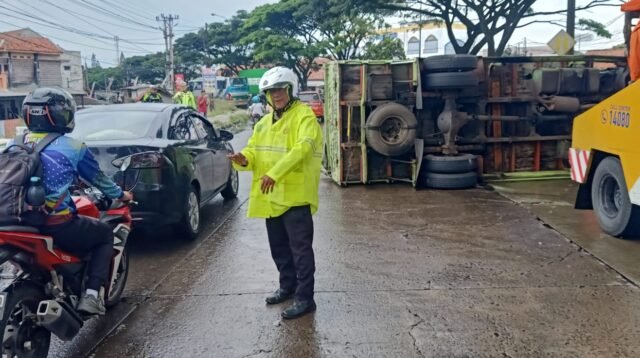 Truk Bermuatan Buah Terguling di Jalan Raya Cipacing–Cileunyi, Polsek Cileunyi Sigap Atur Lalu Lintas