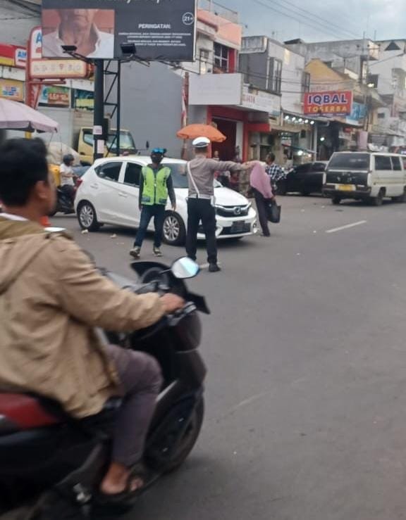 Petugas Lantas melakukan pengaturan kendaraan keluar–masuk area pasar, mengurai titik-titik penumpukan, serta memberikan imbauan kepada pengendara agar tidak berhenti sembarangan yang dapat memicu kemacetan. Selain itu, personel turut membantu menyeberangkan pejalan kaki dan pedagang yang melintas di area ramai guna menghindari potensi kecelakaan.