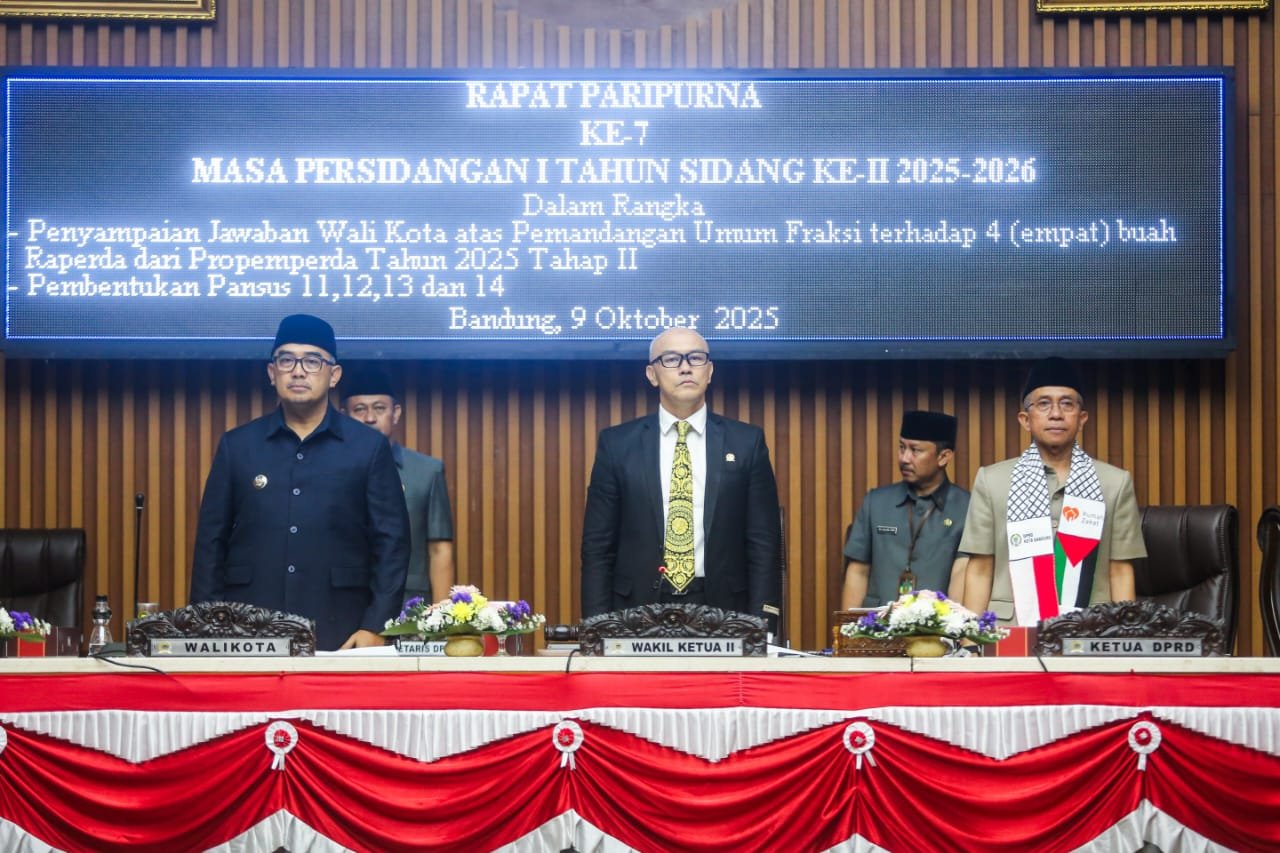 Bandung – Wali Kota Bandung, Muhammad Farhan menyampaikan jawaban atas pandangan umum fraksi-fraksi DPRD Kota Bandung terhadap empat Rancangan Peraturan Daerah (Raperda) dalam Rapat Paripurna DPRD di Gedung DPRD Kota Bandung, Kamis 9 Oktober 2025.